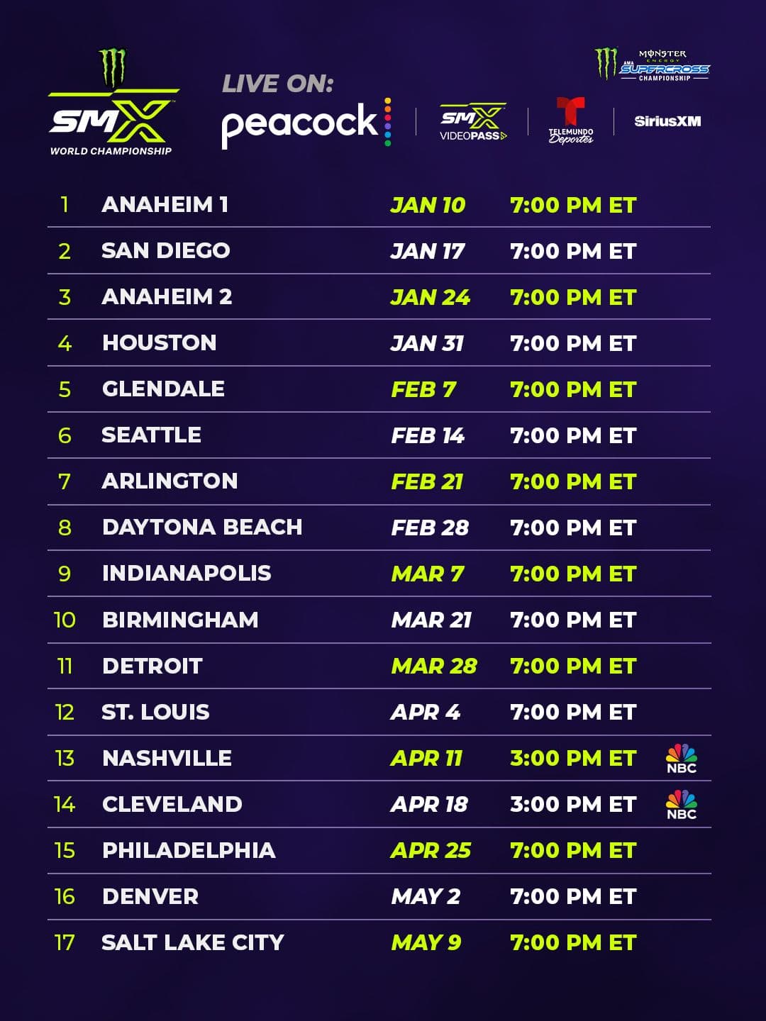 NBC Sports and the SMX LeagueTM announced today the 2026 Monster Energy SMX World Championship broadcast and streaming schedule, including the Monster Energy AMA Supercross Championship and Pro Motocross Championship, sanctioned by AMA Pro Racing. 28 regular season races plus the postseason playoffs across the series, including exclusive live coverage of Main Event races, qualifiers, and heats, will be presented across NBC, Peacock, NBCSN, and NBC Sports digital platforms.