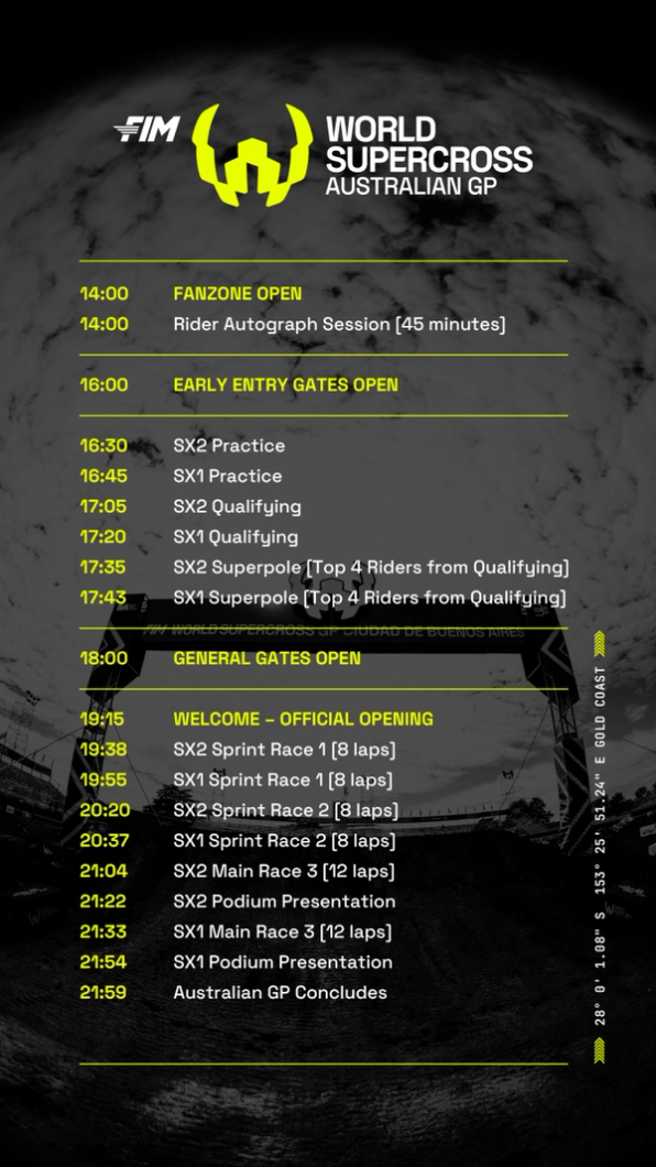 For the Australian SX round you can find everything here: - Computime Race Timing Systems. Live timing here: Fastest Laps. You can watch it live on Danz here: DAZN.
