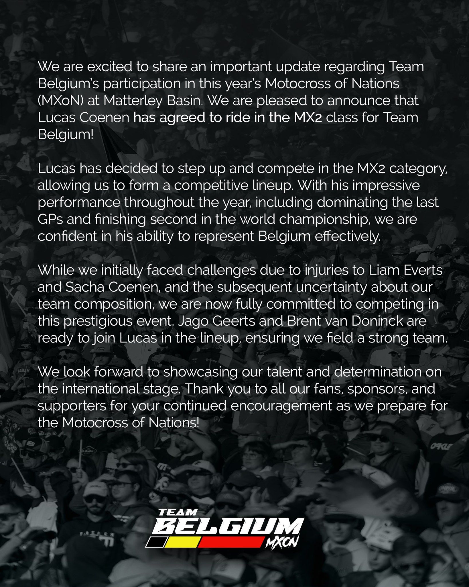 In a rather strange set of circumtances, Team Belgium are now back in the Nations and thankfully now Lucas Coenen will race in the MX2 class at the Matterley Basin event. Below is their press release.