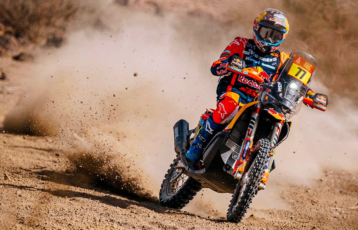 Red Bull KTM Factory Racing’s Luciano Benavides delivered a stellar performance on stage eight of the 2025 Dakar Rally, securing his first stage win of the event. After stopping mid-stage to assist a fellow rider, Benavides recovered brilliantly to claim victory by more than two minutes once his lost time was reallocated. The result elevates the #77 to fourth in the overall standings.