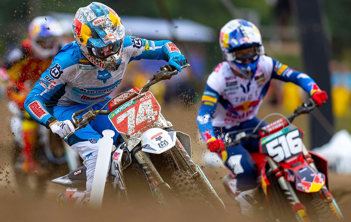 Nestaan Husqvarna factory rider, Kay De Wolf extended his MX2 championship points lead as he won the opening MX2 moto this afternoon in Lommel. The Dutchman led took the lead early, then crashed and lost the lead, before regaining it again and pulled a large gap to second placed Ferruccio Zanchi, who was one of the few riders to keep the bike on two wheels (but crashed in the final laps). Zanchi would lose second late in the race as Elzinga made the pass to make it a Dutch 1-2, with South African McLellan third.