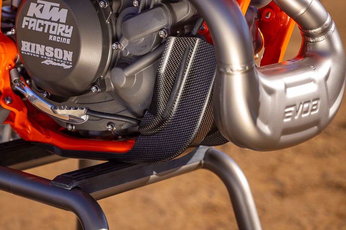 Elsewhere improvements with the KTM SX-F FACTORY EDITIONs can be felt in practicality and resistance against the gnarliest of track conditions thanks to a new radiator closure (also making for easier access) and a freshly designed protection cap for the fuel line quick-lock system. Careful engineering with the airbox, air filter and fuel injection along with collaboration with partner Akrapovic means the 109-decibel noise level, FIM compliant, can be met with the remodeled titanium silencer without loss of the trademark KTM SX-F torque and power.