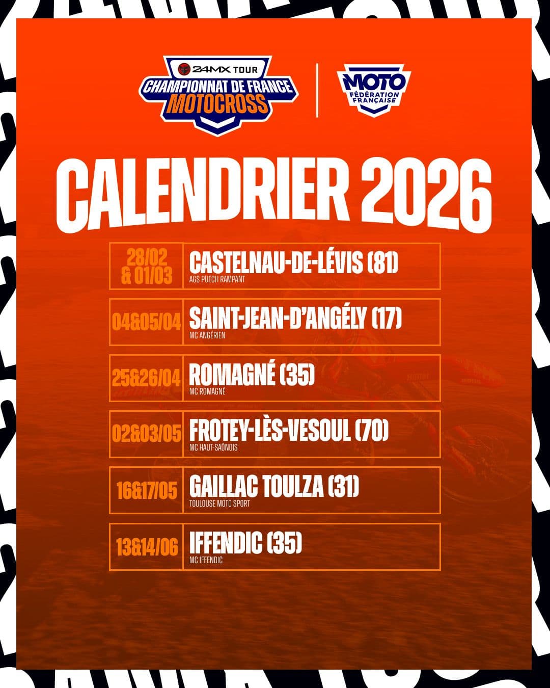 Saint-Jean-d'Angély and Romagné return to the calendar after a 2025 season marked by their respective Grand Prix while the 24MX caravan will return to Gaillac-Toulza, the circuit that received the MX1 and MX2 riders in 2025. We will also be pleased to return to Vesoul and Iffendic after two seasons marked by their absences from the calendar.