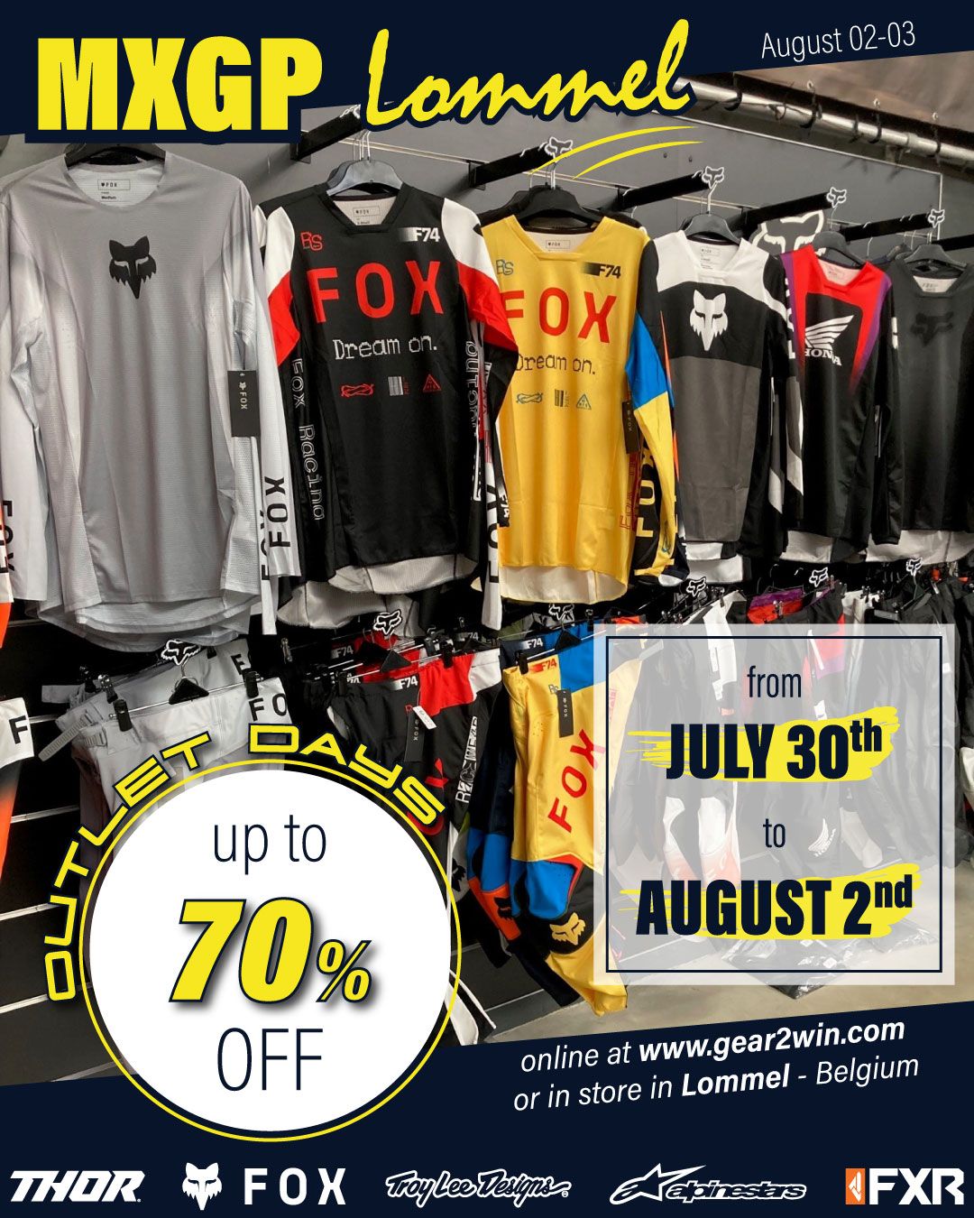 If you are heading to Lommel for the MXGP of Lommel, then check out the Gear2win OUTLET Days are back from July 30th to August 2nd during the MXGP of LOMMEL, up to 70% OFF.