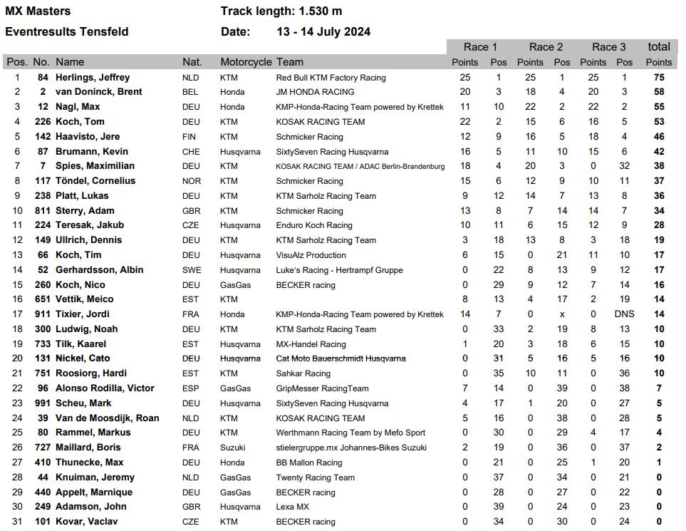 Five time World motocross champion Jeffrey Herlings of the Red Bull KTM Factory team impresses with a triple triumph in his guest appearance. Brent van Doninck drives to second place with a lot of fighting spirit. Max Nagl extends his championship lead with third place on the day in Tensfeld.