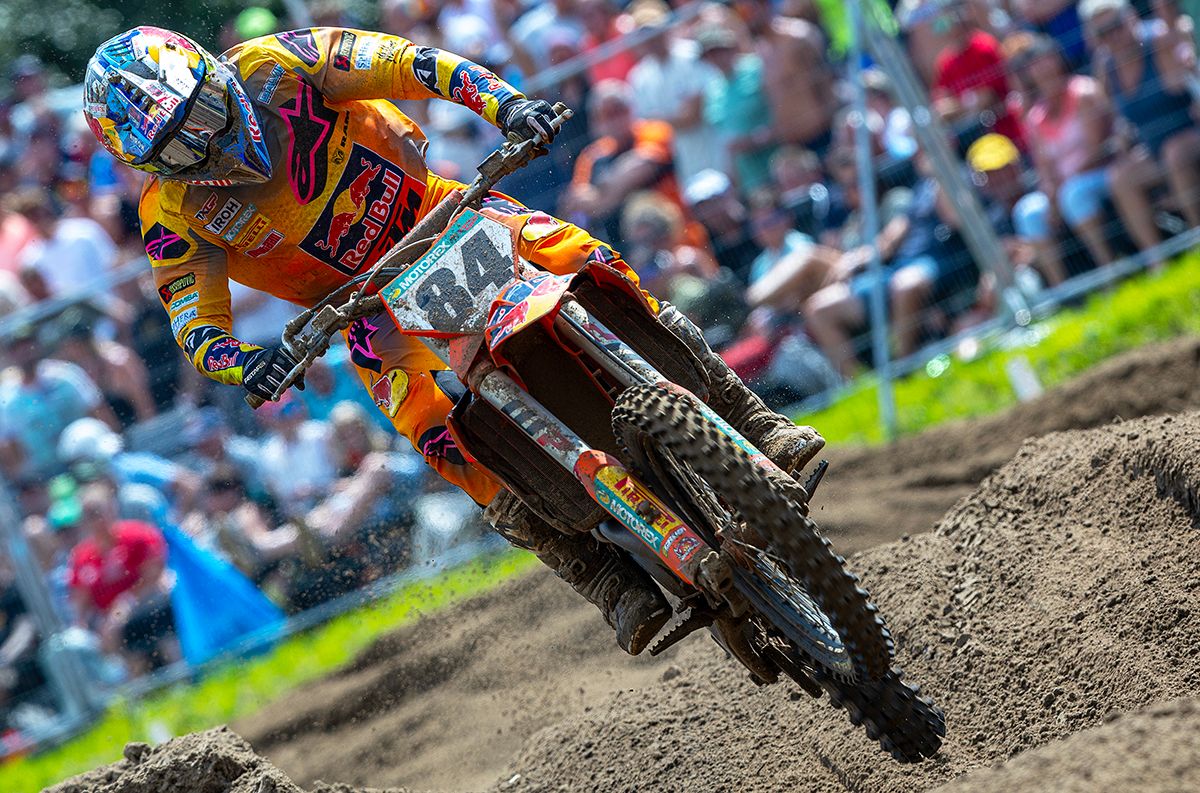 Bobby Bruce led from Herlings in the opening MX1 moto, but Herlings quickly into the lead and using his Lommel form to get away. Mewse was 11th, and some big names in the top ten were Gilbert fourth, Martin Barr in seventh.
