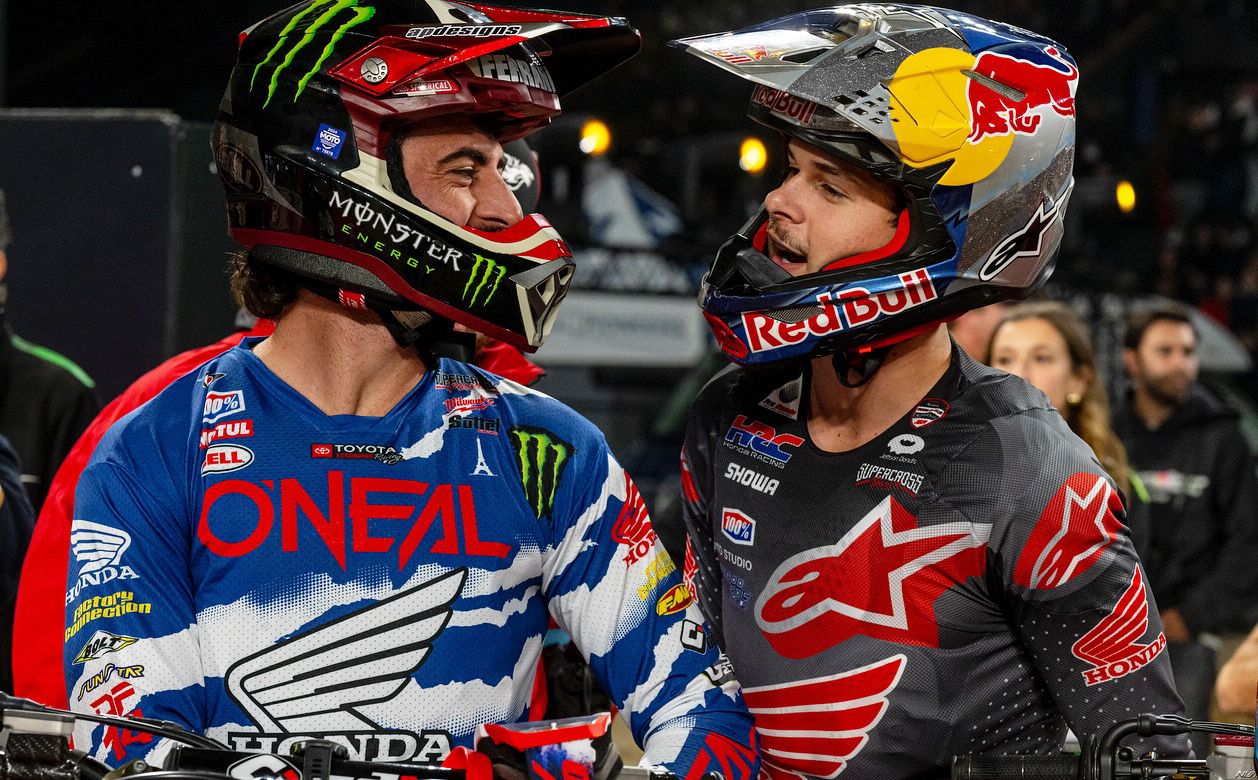 Jett Lawrence took his fifth race win in the second SX1 race today in Paris. The Aussie hunted down early leader, Cooper Webb and made a pass in the whoops section, where the HRC man was super-fast. Third was Hunter Lawrence.