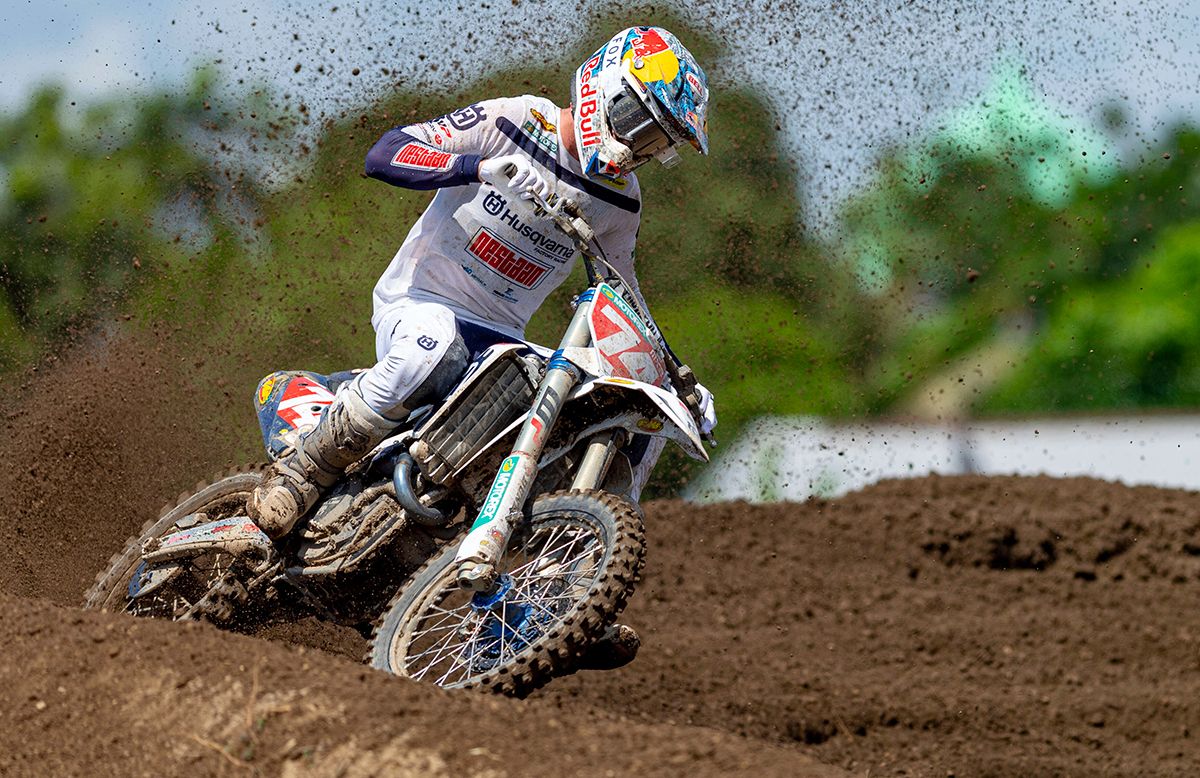 In really tough, warm conditions, and with one moto being dry and the other muddy, the red-headed Dutchman came out swinging, to go 1-1 and really put his stamp on the opening Indonesian round.