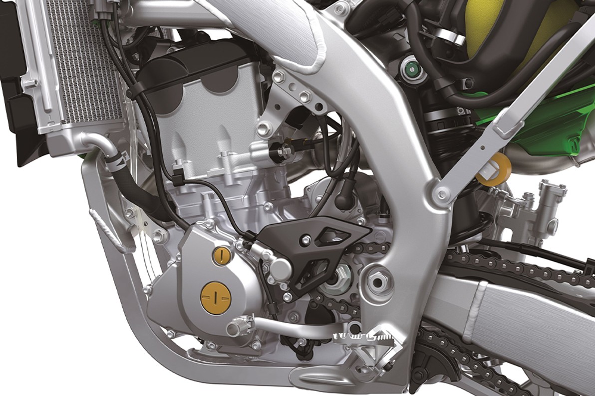 The new single-shaft primary engine balancer contributes to smoother power delivery and reduced vibration for improved throttle control, especially when exiting slower-speed corners. A semi-dry sump lubrication system helps create a quicker engine response since most of the oil is stored in the transmission to keep extra oil away from the crankshaft and prevent power loss. With a shallow chamber to collect oil at the bottom of the crankcase, where a scavenge pump moves it to the transmission, the crank is located as low as possible to help lower the engine’s center of gravity. Twin oil pumps ensure proper lubrication for increased performance, and the radiators are turned 10 degrees inward which further narrows the profile of the KX™250.