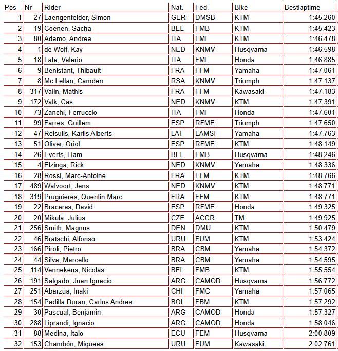 Langenfelder takes the quickest time with a 1.45.260 and KTM continued to own the practice. Coenen a quick lap late, but couldn’t top the time of Langenfelder. Everts 14th quickest and Elzinga 15th.