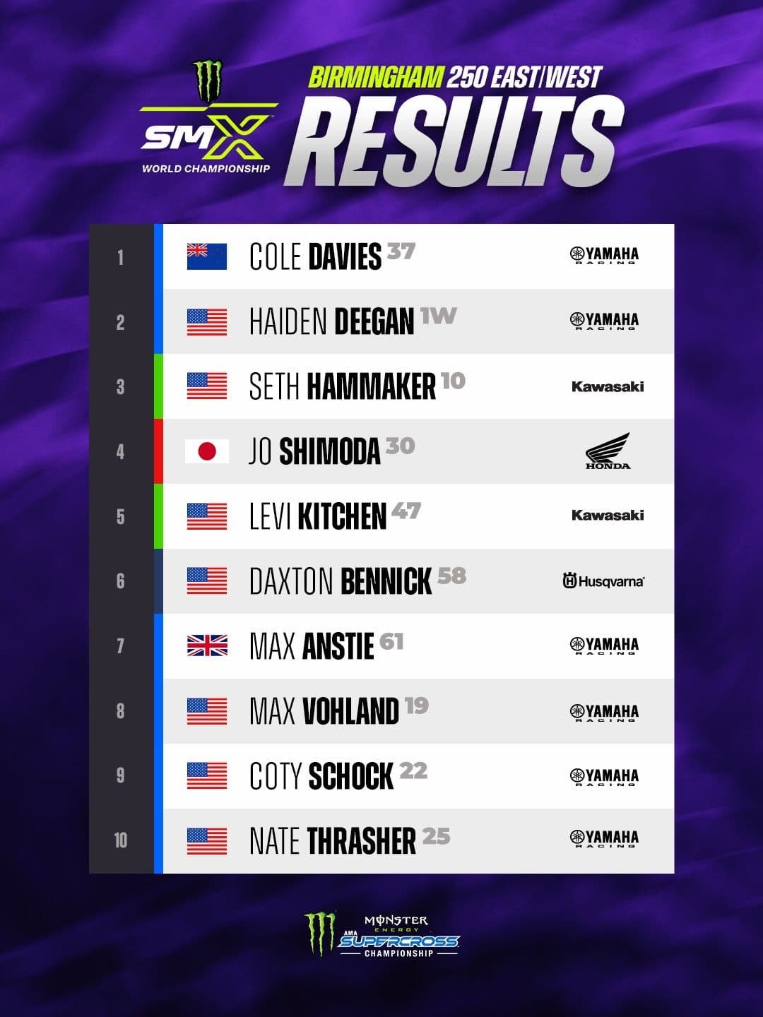 In the 250 class, Haiden Deegan won, but was docked a point and that handed the victory to New Zealander, Cole Davies, with Deegan second and Seth Hammaker third.