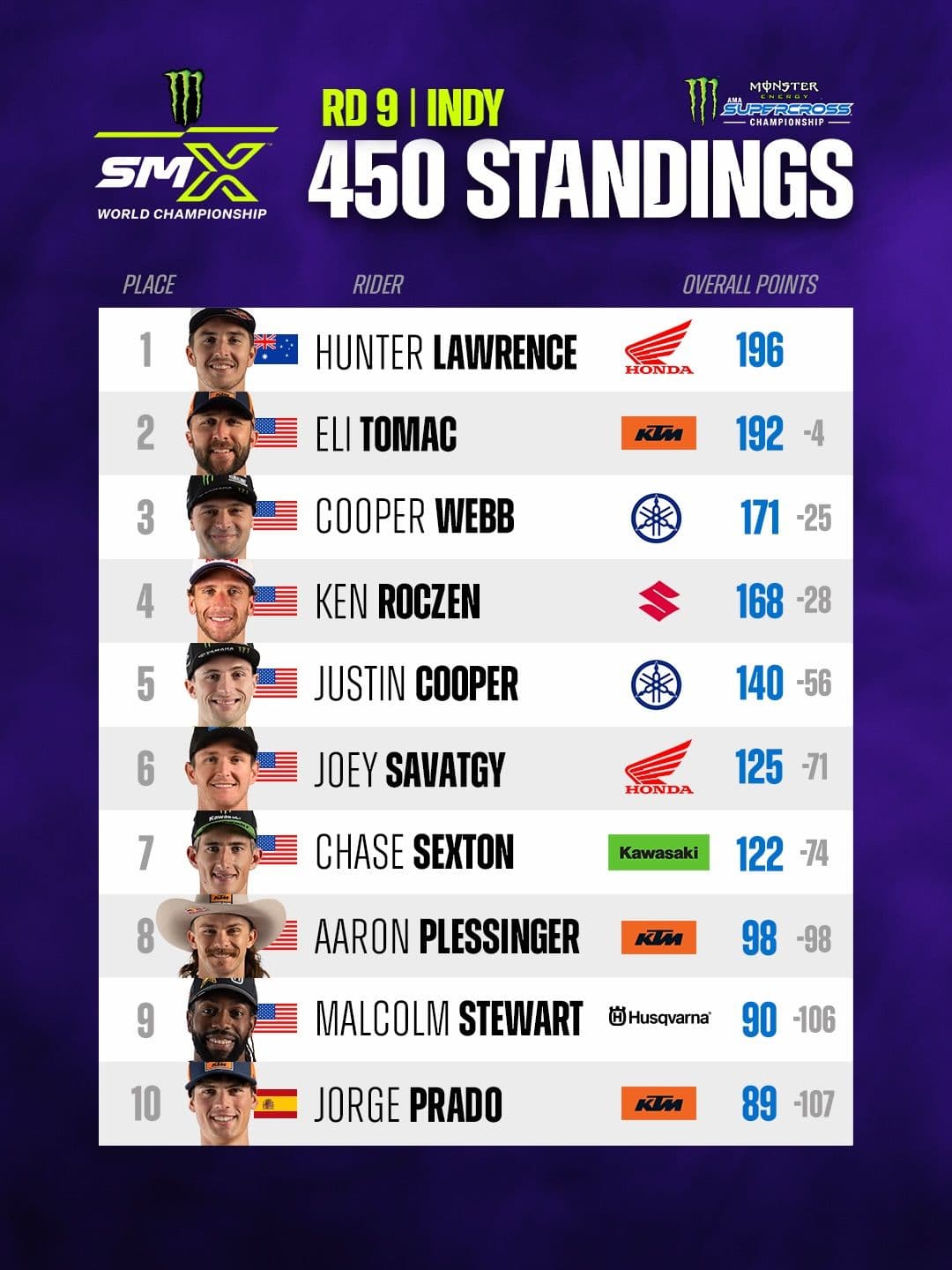 The biggest win of the season thus far for Lawrence allowed him to extend his lead in the title fight to four points over Tomac heading into the lone off weekend of the 17-race championship. Webb sits third, 25 points out of the lead.