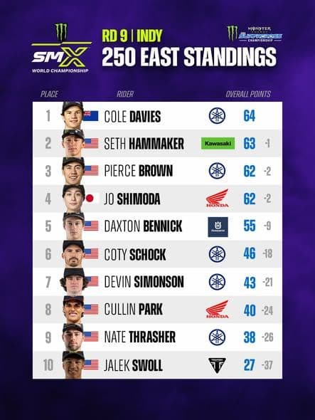 The early title fight has tightened up dramatically as four riders now sit within two points of one another. Davies has grabbed hold of the points lead by a single point over Hammaker, while Brown and Shimoda sit tied for third, two points out of the lead. What lies ahead is the first East/West Showdown of the 2026 season, which is poised to dramatically alter what has been a close battle in the Eastern Division thus far.