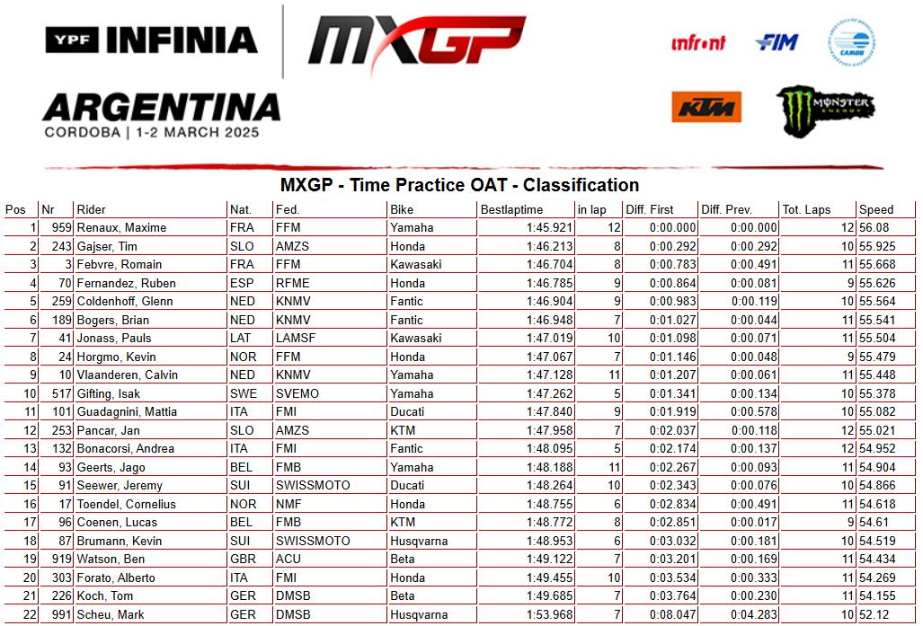 Monster Energy Yamaha rider Maxime Renaux was quickest in the MXGP timed practice with a last lap charge to clock a 1.45.921 and steal the top spot from Tim Gajser, who finished second and third was Romain Febvre.