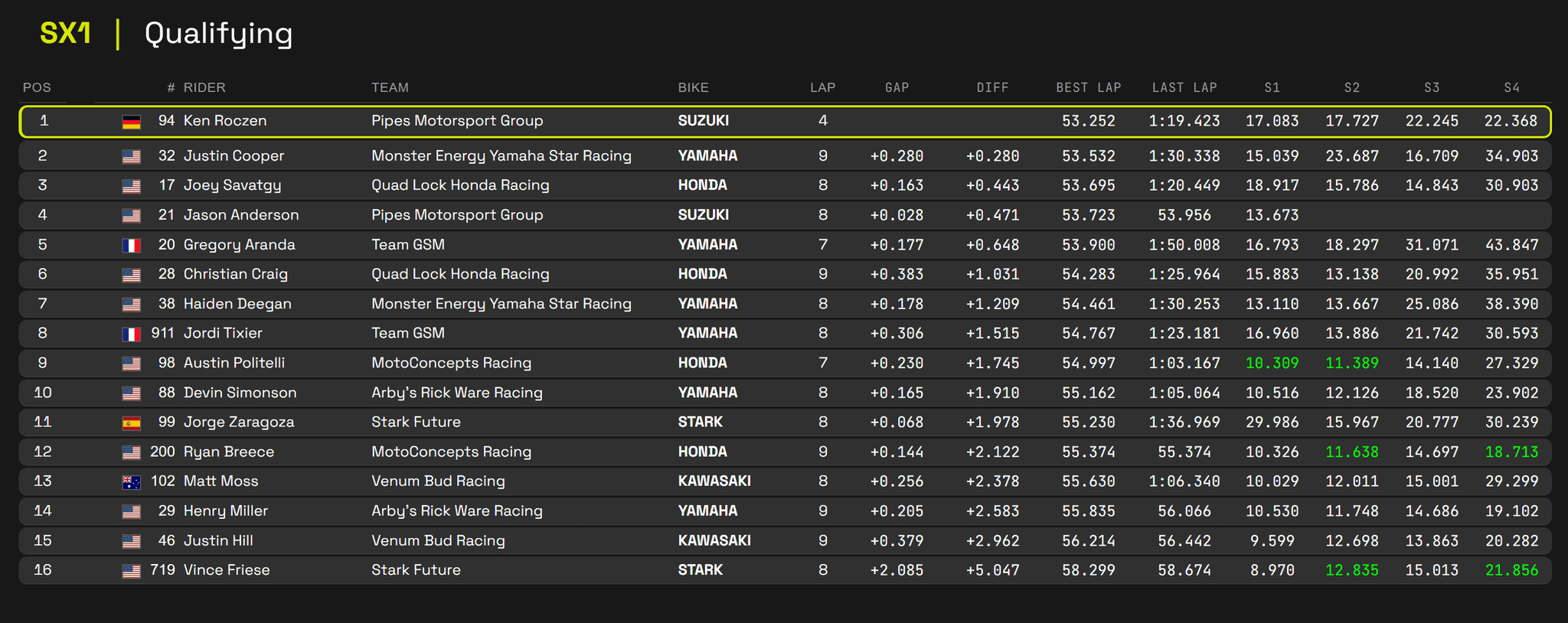 Ken Roczen has clocked the quickest time in qualification with a Justin Cooper second quickest, then Joey Savatgy and Jason Anderson. Haiden Deegan finished in seventh spot. Th top four go through to the super pole.