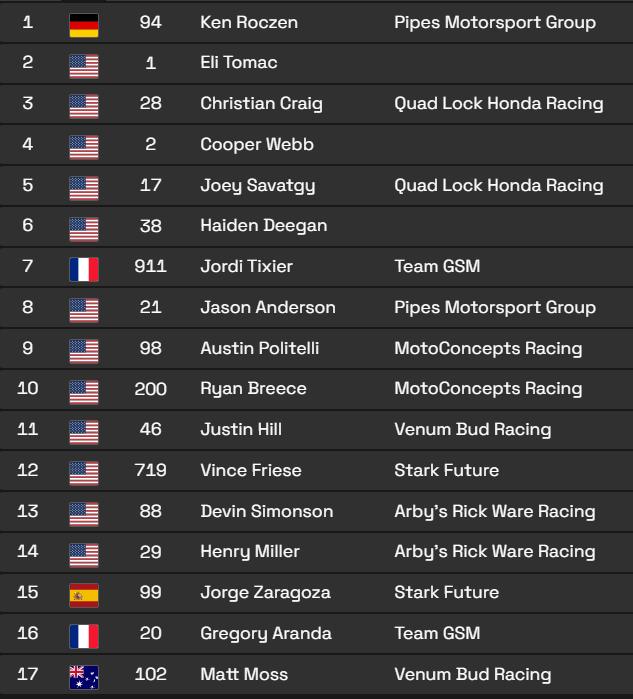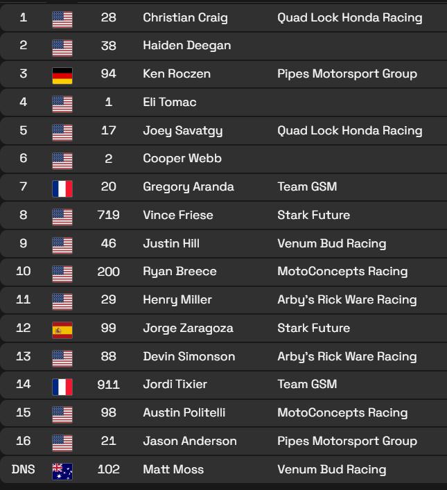 Craig makes a block pass on Tomac and takes the lead, with Deegan not that far back. Craig opened his lead over Tomac with Deegan a similar distance back in third, then Aranda, Savatgy, Webb, Roczen, Friese, Politelli and Breece.