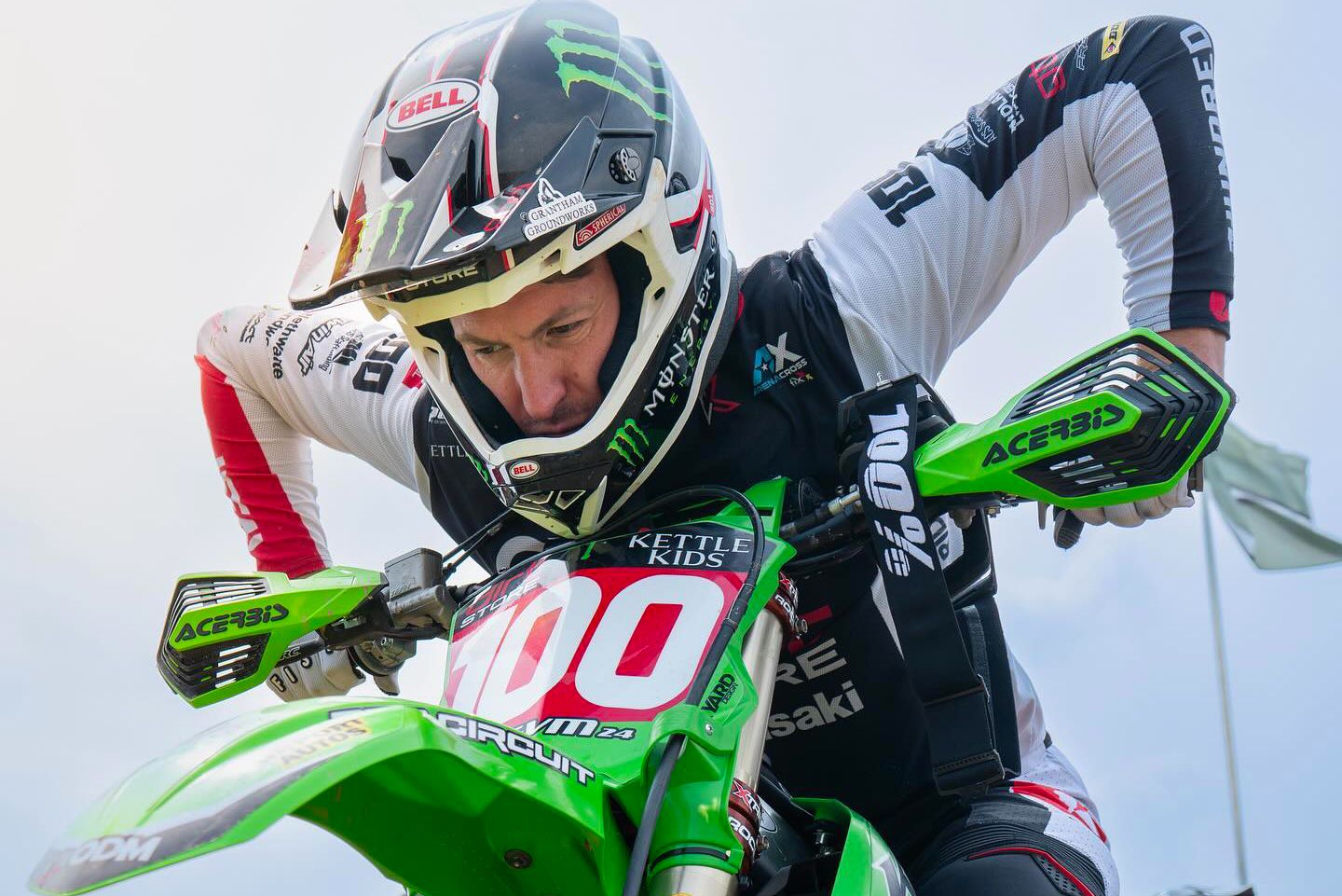Former World number two and multiple British motocross and Arenacross champion Tommy Searle of the Dirt Store Kawasaki team has won the overall for the MX2 class at the Hawkstone Park round of the British championship and Fastest 40 series.