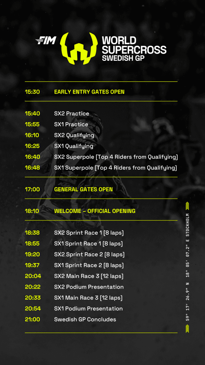 Another round of the World Supercross Championship of 2026, this time in europe and Sweden. As always, we will bring you all the action, images, interviews and so much more. Live timing and full results you can find here: Race Day Live.