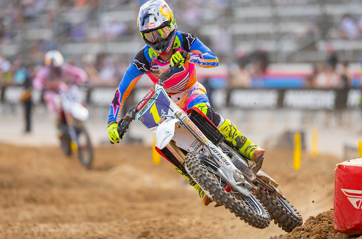 The Australian’s timing was impeccable, as the win came at SuperMotocross World Championship Playoff 2, which paid double points, putting him in first place in the title chase, with only the Final remaining. Meanwhile, younger brother and defending champion Jett Lawrence ended the day third overall via a 3-2 moto tally.