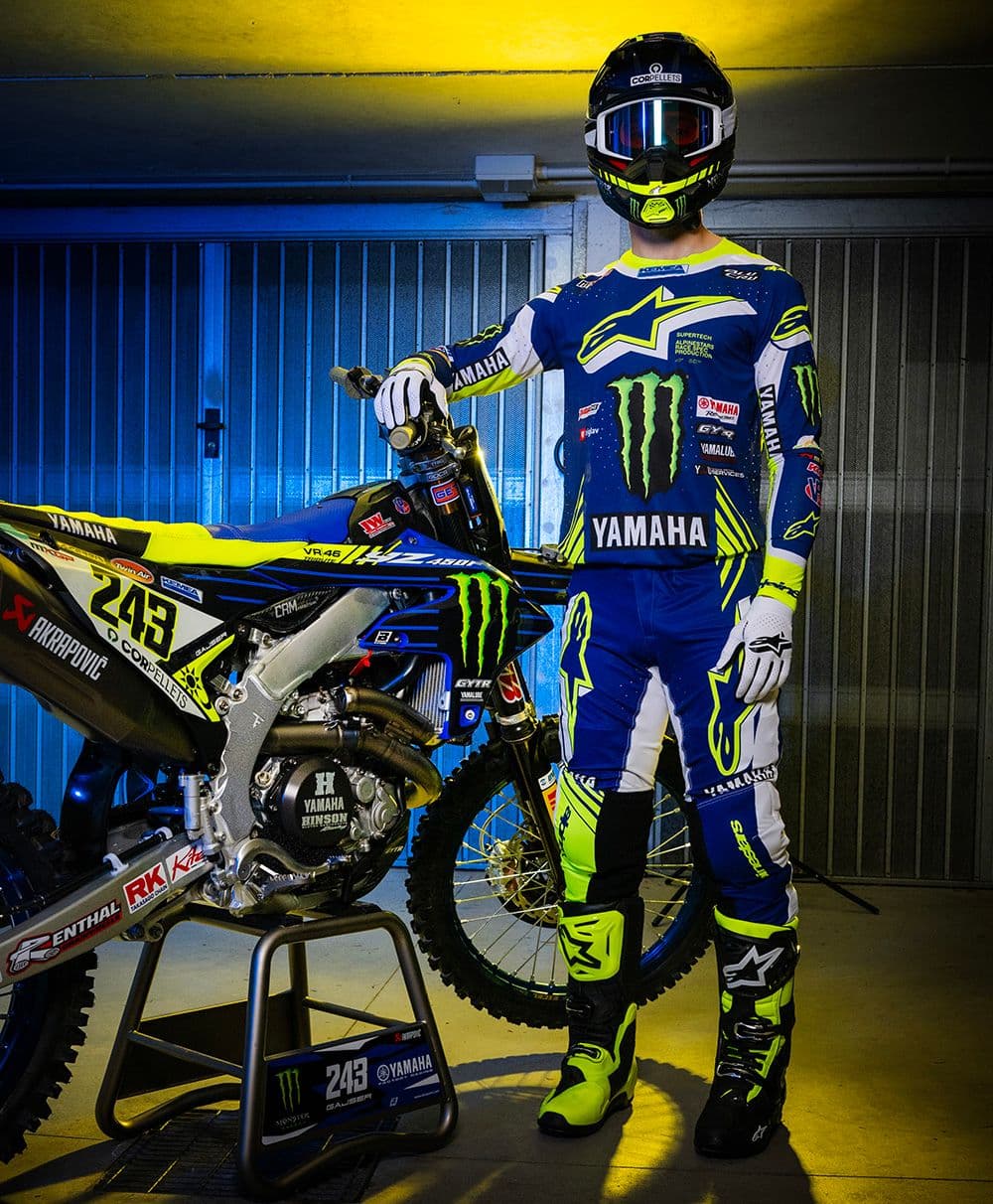 Yesterday morning, Belgian photographer, Bavo Swijgers was put to work by Yamaha to produce this very cool Rossi look with the bike and gear of five time world champion, Tim Gajser. Its something Yamaha often do with their riders and it is a very nice look.