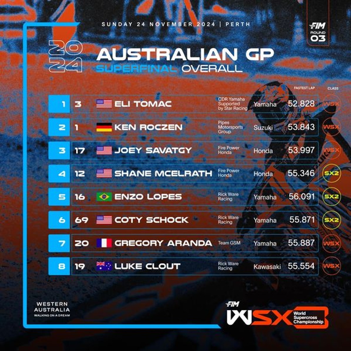 In Sunday’s multi-class SuperFinal, the top eight riders in the WSX and SX2 fields again faced off, with Tomac, Savatgy, Roczen, Aranda, Oldenburg, Clout, and Friese representing the premier 450cc class in the climax to the WSX Australian GP.
