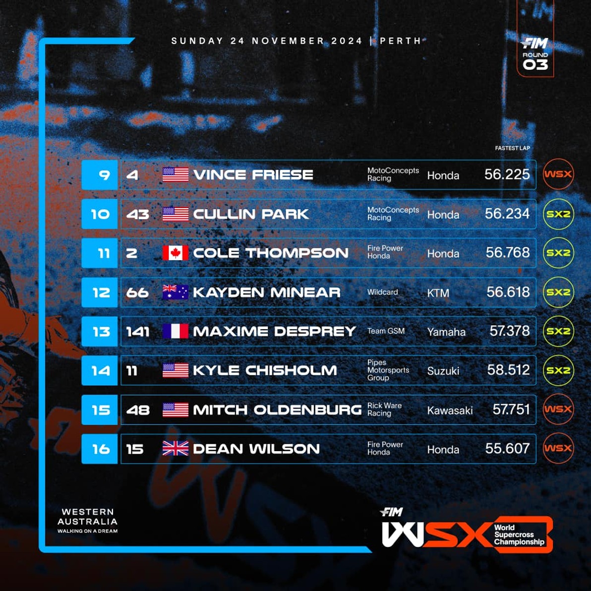 Further down the field, an accident for Colt Nichols forced the PMG rider to withdraw from the remainder of the WSX Australian GP due to injury, with the rider of the #45 Suzuki being taken to the Perth Royal Hospital for medical checks.