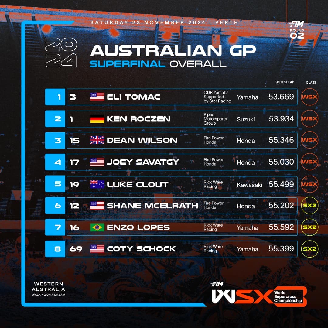 Multiple AMA supercross champion Eli Tomac has once again shown he is a class act as he won the opening night of the WSX championship in Perth, Australia. The Star Yamaha rider is a heavy favourite now to be crowned World supercross champion heading into another round tomorrow night and then the final round in Abu Dhabi.