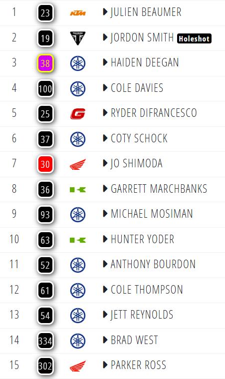 The Star Racing Yamaha men, Webb and Tomac battling for first place as Jett Lawrence looks for a way to get past Roczen. Plessinger out of the race with sickness and Lawrence into third as he passed Roczen. Lawrence all over Tomac and Webb and looking very fast. Tomac into the lead and Lawrence into second as Webb is dropped to fourth.