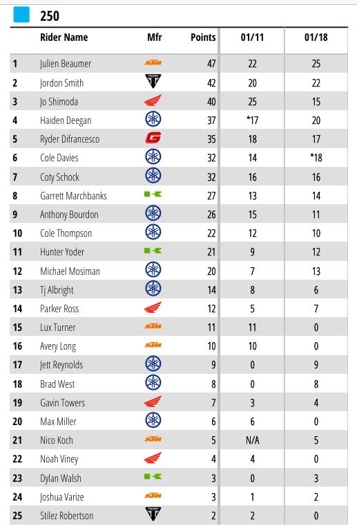 Julien Beaumer won the 250 main from Jordon Smith and Haiden Deegan. Jo Shimoda, who was riding with two broken fingers finished a brave seventh.