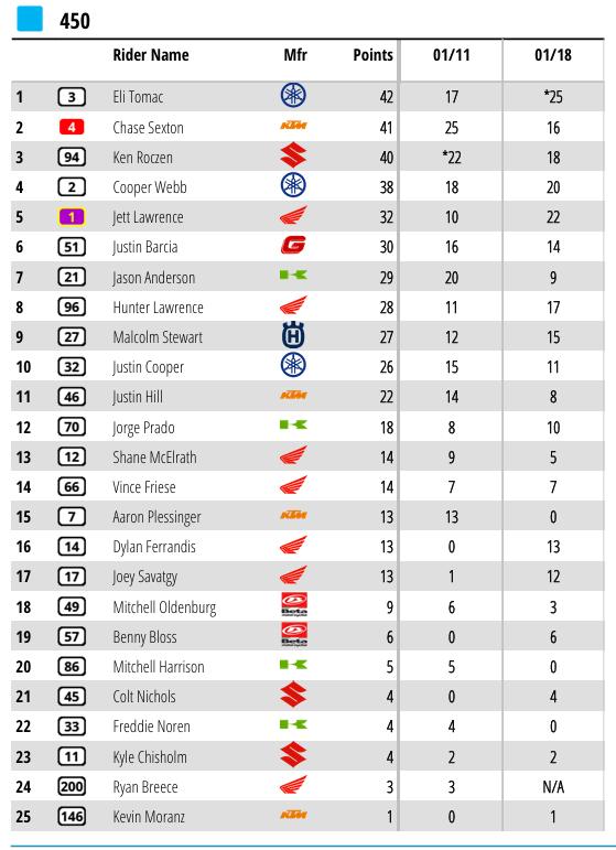 The top ten was Webb, Roczen, Lawrence, Tomac, Stewart, Jett Lawrence, Friese, Savatgy, Anderson, Ferrandis. Tomac into third as he passed Hunter Lawrence and Jett Lawrence passed Stewart, A lot happening in this San Diego main event, Sexton up to 18th place. Prado in 13th and not looking great. This supercross game is tough for rookies.